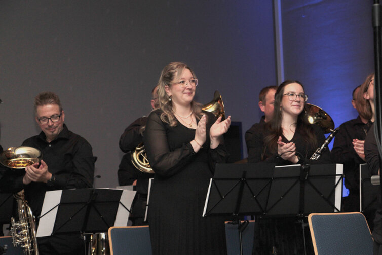 „Traumwelten“ nämlich lautete auch das Motto des diesjährigen Frühjahrkonzertes, das durchaus als kräftiger Nachschub zum ausverkauften Jubiläumskonzert im November des vergangenen Jahres 2025 betrachtet werden kann. Geschäftsführerin Marianka Hammer begrüßte die vielen Gäste, unter ihnen Marco Müller, Bürgermeister der Stadt Netphen und Daniel Crecklow, Vorsitzender des Volksmusikerbun-des, Kreisverband Siegen-Wittgenstein. Die Moderation oblag Katja Eling. Alle Titel wurden auf eine Lein-wand projiziert - zum Teil in moderner KI-Technik. Selbst die Dirigentin wurde mit „Face Swap“ in eine Garde-Uniform integriert.